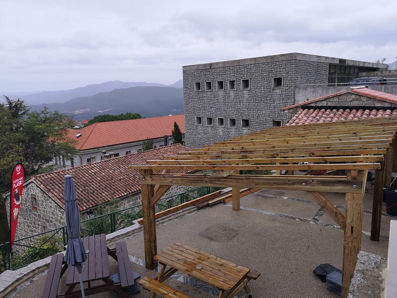 Exercice de charpente traditionnelle pour mettre à l’abri de la pluie et du soleil les tables d’un restaurant.